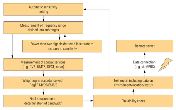 由于天線之間可以組合(相互之間、與地面之間已解耦,低頻范圍為全向環(huán)形天線,高頻范圍為全向電場天線),因而設(shè)備不必在測試現(xiàn)場進行校準。R&S? ESPI 測試接收機負責(zé)執(zhí)行測量,由于結(jié)合使用了預(yù)選器和前置放大器,因而可同時檢測強、弱信號。測量序列依靠 R&S? RFEX EMF 軟件的特殊功能處理,該軟件是成熟的便攜式電磁場測量系統(tǒng)R&S? TS-EMF的一部分。測量和分析由一系列步驟組成,并可不斷地重復(fù)(如圖所示)。儀器在測量整個頻率范圍之前,首先自動地調(diào)整靈敏度以防止發(fā)生過載,各頻率子范圍可選擇不同的設(shè)置。為了確保各子頻率信號的測量,必要時可提高靈敏度重新進行測量。為了準確地對此類復(fù)雜信號進行加權(quán)處理,需對重新定義的無線電業(yè)務(wù)(具有合適的帶寬和特定設(shè)置)進行測量。信號經(jīng)評估和數(shù)據(jù)精簡處理后通過帶寬檢查其合理性,測量結(jié)果會隨同環(huán)境和系統(tǒng)狀態(tài)數(shù)據(jù)一并發(fā)送,后續(xù)詳細分析時需要的中間步驟和原始數(shù)據(jù)則可以存儲在本地硬盤上