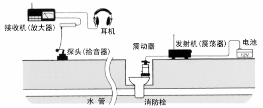 如下圖所示,放在消火栓上的NPL-100振蕩器發(fā)出的聲波信號沿埋于地下的壓力水管內部傳遞,該聲波信號亦能傳至地面。NPL-100的拾音器在地面上捕捉該聲波信號,接收機將信號放大并通過儀表和耳機指示