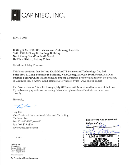 2014年7月14日,北京康高特科技有限公司獲得了美國CAPINTEC,INC.公司在中國的代理權(quán)。