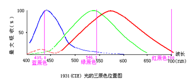 1931年國(guó)際照明委員會(huì)(CIE)規(guī)定紅、綠、藍(lán)三種原色光的波長(zhǎng)分別為:700nm、546.1nm、435.8nm。為了理論闡述上的方便,我們把這三種原色光的位置標(biāo)記在“視網(wǎng)膜視錐細(xì)胞的光譜吸收曲線圖”上,(見下圖)。在這張