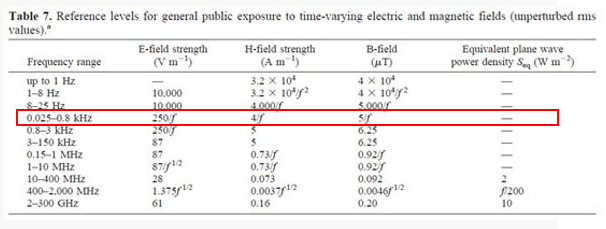 【ICNIRP對公共人群制定的電磁場安全參考水平[1]。50Hz的電磁場應參考第四行,其中電場限值為250/f,頻率f=0.05kHz,因此限值為5000V/m;磁場限值為5/f,同理計算可得限值為100μT。)】