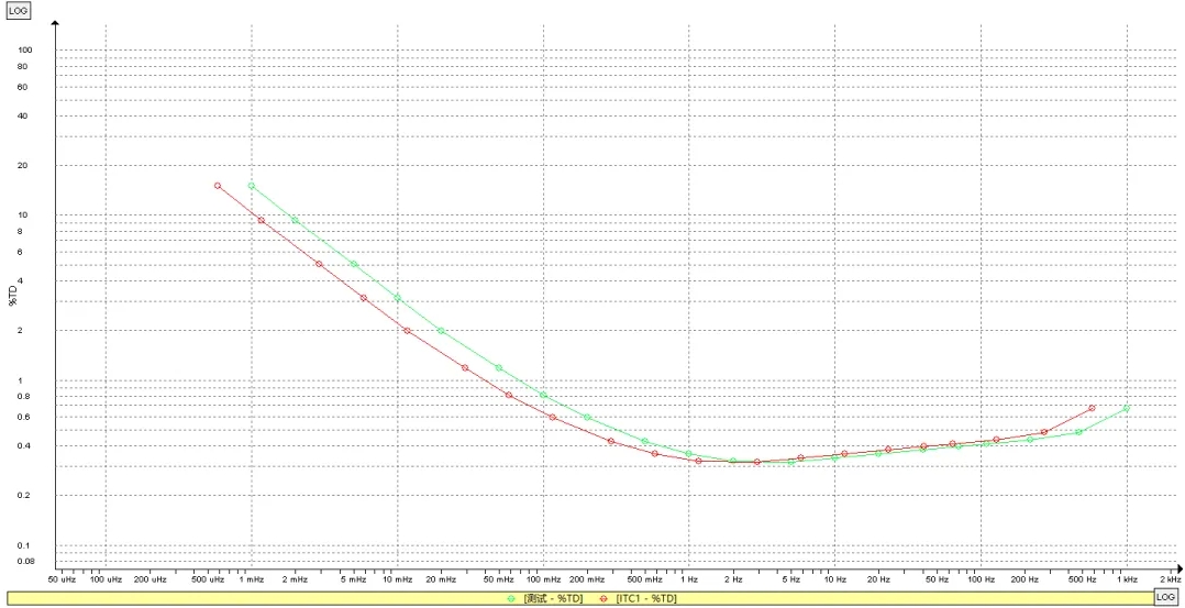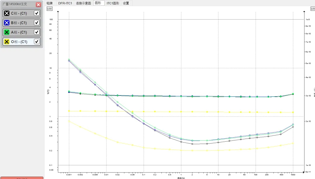 由圖中可以看到四根套管測(cè)量所得的*低點(diǎn)頻率均小于50HZ,表明四根套管絕緣狀態(tài)正常。(根據(jù)行業(yè)標(biāo)準(zhǔn)《油紙絕緣電力設(shè)備頻域介電譜測(cè)試導(dǎo)則》DL/T2231-2021)5.4測(cè)試結(jié)果的判斷,絕緣判斷分析:頻域介電譜測(cè)試異常可包括絕綜紙(板)受潮、絕綜油電導(dǎo)率升高、蠟、游碳、腐蝕性硫等化學(xué)污染。油浸紙?zhí)坠艿呐袛喾椒闋顟B(tài)良好的絕緣局部*低介質(zhì)損耗頻率點(diǎn)小于50HZ,絕緣較差的局部*低介質(zhì)損耗頻率點(diǎn)高于50HZ,絕緣缺陷原因應(yīng)結(jié)合其他電氣試驗(yàn)和化試驗(yàn)綜合判斷。)